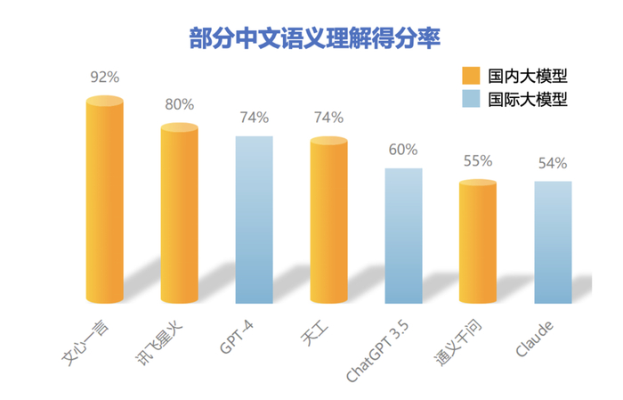 其中,在部分中文语义理解方面,文心一言以92%的得分率排名榜首,超越讯飞星火、GPT-4。凭借知识增强的核心特色,文心一言对本土语言特性把握更精准,同时由于训练语料中包含大量本土文本,对本土文化理解也更深刻,能够更好处理与本土文化相关的主题和背景,如诗歌、方言等,具备更强的国内落地空间。