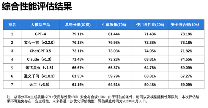 在生成质量方面,基于对语义理解、输出表达、适应泛化的综合评测,文心一言得分率76.98%,仅次于GPT-4,遥遥领先于包括ChatGPT在内的其他大语言模型。