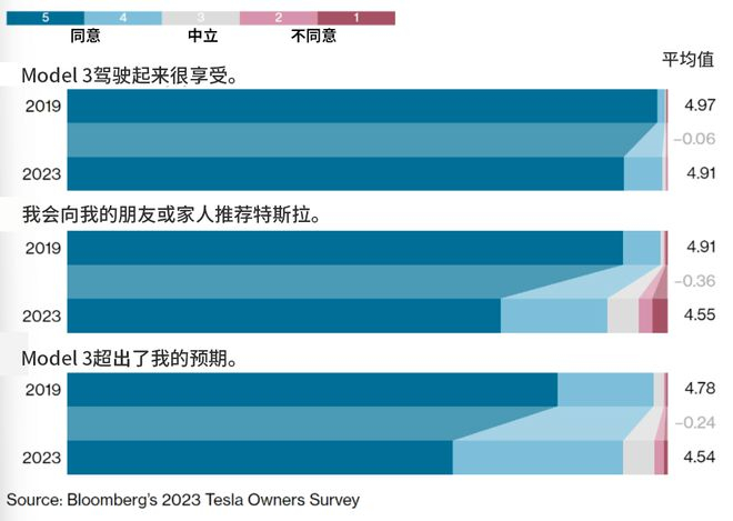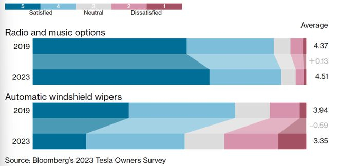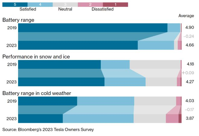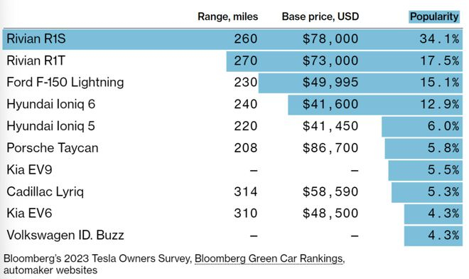Sources: Bloomberg’s 2023 Tesla Owners Survey, Bloomberg Green Car Rankings, Tesla