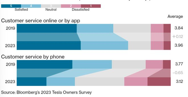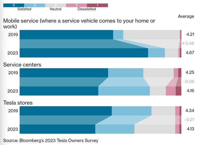 然而,评论并没有太大的改善,服务评论仍然褒贬不一。一个亮点是特斯拉的移动服务获得了赞同,在该服务中,被派往车主的家或办公地的小货车能修理车辆。到2023年,更多的客户体验了这种小货车——他们继续为之惊叹。另一方面,对服务中心和门店的满意度则有所下降。