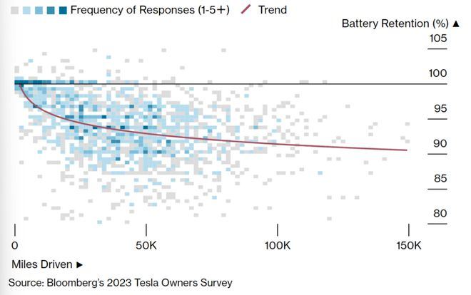 彭博社向Model 3车主提出了一系列问题,以评估电池退化情况。我们还对部分特斯拉车主进行了第二次调查,从中获得了Model Y的数据。根据这采集到的数据结果,我们能够估计这两款车的车主可能会期望什么。