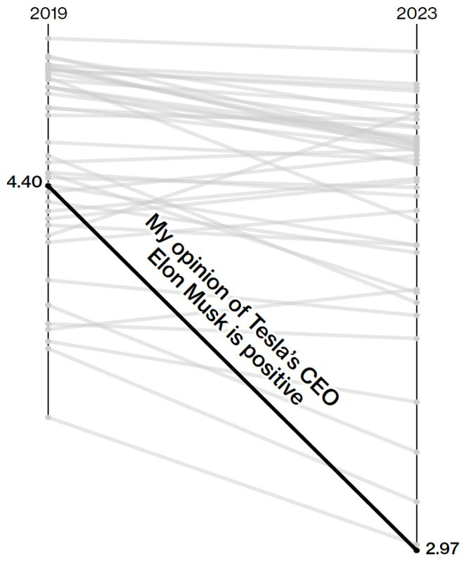 2019年~2023年,与特斯拉有关的所有话题中,对首席执行官的信心下降幅度最大。