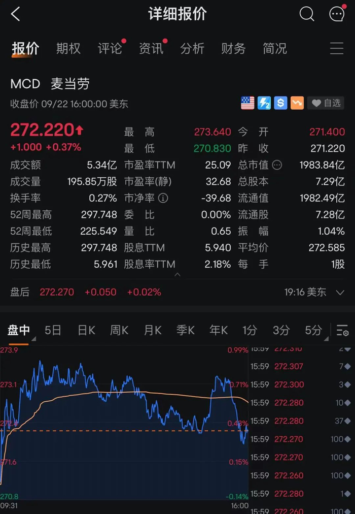 截至周五美股收盘,麦当劳(MCD)股价报收272.22美元,涨0.37%,总市值为1983.84亿美元。