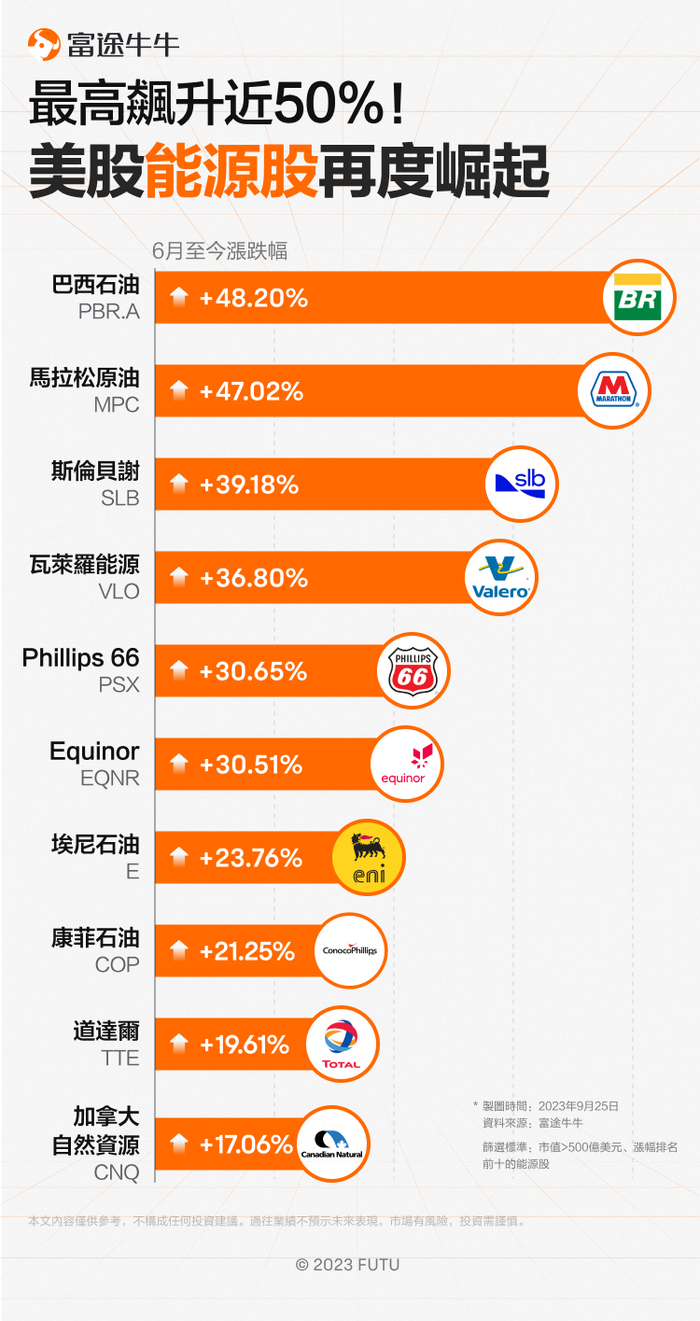 进入三季度后,美股能源股走势确实出现逆转,成为标普500指数中表现最好的板块之一。其中,$巴西石油公司-Prefer(PBR.A.US)$、$马拉松原油(MPC.US)$等多只能源股涨超30%。