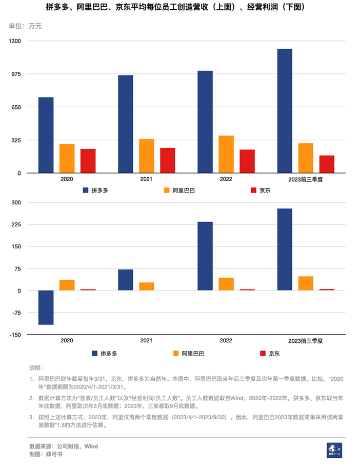 按照2023年前三季度1588亿元的总营收计算,拼多多员工前三季度人均创收1222万元,是同期京东的7.07倍,预估是阿里的4.17倍;人均经营利润是京东的55.8倍,预估是阿里的5.81倍。(阿里数据估算方法详见下图“说明”部分)