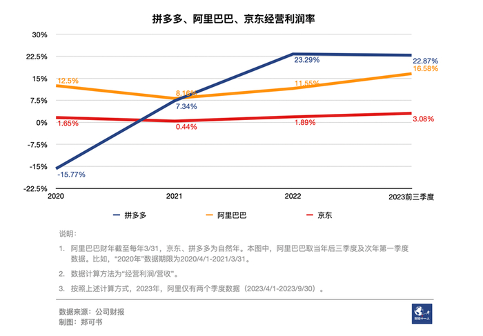 拼多多2021年首次扭亏为盈,录得正经营利润。当年,其经营利润率即大幅超过京东,逼近阿里,并于次年反超阿里、保持领先至今。2023年前三季度,拼多多经营利润率是京东的7倍,约为阿里的1.4倍(计算方法详见下图“说明”部分)