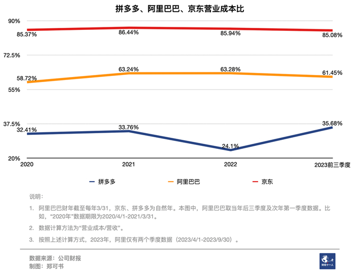 拼多多营业成本在总营收的占比在三家公司中保持最低。也就是说,每挣一元钱,拼多多花的营业成本比阿里、京东都要少。2023年前三季度,这个数字大约是阿里的六成、京东的四成。(计算方法详见下图“说明”部分)