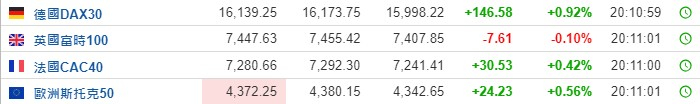 2. 截至发稿,德国DAX指数涨0.92%,英国富时100指数跌0.10%,法国CAC40指数涨0.42%,欧洲斯托克50指数涨0.56%。