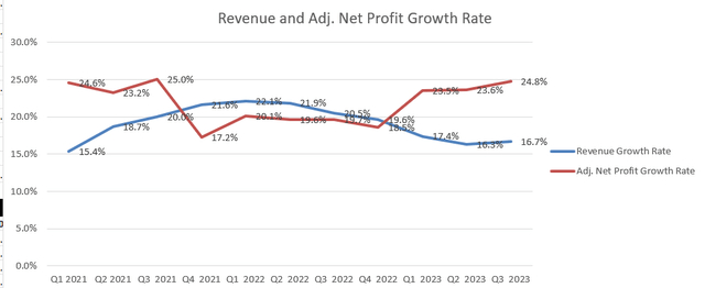 他们在2023年第三季度取得了令人瞩目的业绩,收入同比增长 16.7%,调整后利润大幅增长 24.8%。该公司提高了全年营收和利润指引,其中 2024 财年订阅收入指引显着增加至 65.98 亿美元,同比增长 19%。此外,全年运营现金流指引上调至19.75亿美元,同比增长19%。