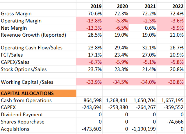 作为一家 SaaS 公司,他们的毛利率超过 72%,这得益于强劲的递延收入,这有助于提供非常强劲的净营运资本。历史收入增长率超过 20%,他们指导长期订阅增长 17%-19%。他们的自由现金流利润率超过20%,表明未来扩张空间充足。这是由于订阅量的不断增加、运营杠杆的增加以及利润率的提高所推动的。