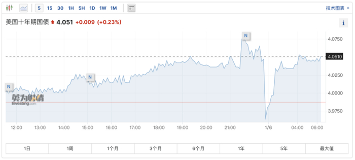 12月非农就业报告披露后,美国10年期国债收益率直线飙升,一度涨超10个基点,达到4.085%。