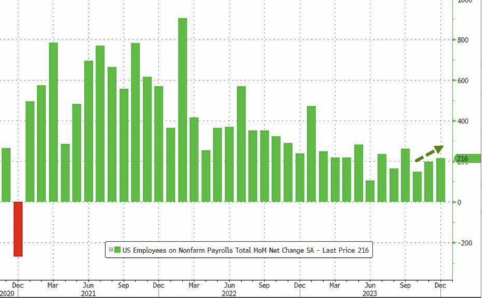对于华尔街而言,2024年第一周的“压轴大戏”无疑是美国非农就业数据。北京时间1月5日晚间,美国劳工统计局公布的2023年12月非农就业报告显示,美国12月非农就业人数增加21.6万人,大超市场预期的17.5万人,也超过前值的19.9万人。