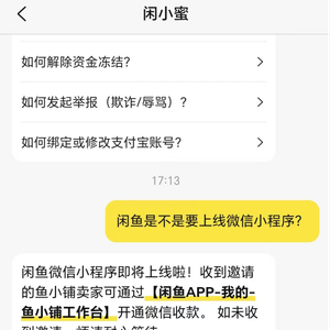 随后,时代周报记者向闲鱼客服求证此事。客服回复称,闲鱼微信小程序即将上线,收到邀请的鱼小铺卖家可通过“闲鱼APP-我的鱼小铺工作台开通微信收款”。