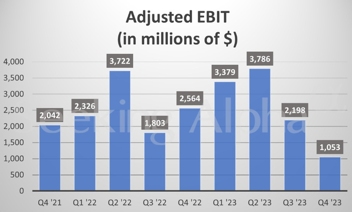 福特预计今年的EBIT利润为100亿至120亿美元,而2023年为104亿美元。这一结果处于该公司去年11月公布的100亿至105亿美元的指引区间顶端,当时该公司在UAW举行为期六周的罢工后下调了指引。该公司还预计今年调整后自由现金流为60亿至70亿美元;资本支出预计在80亿至95亿美元之间。