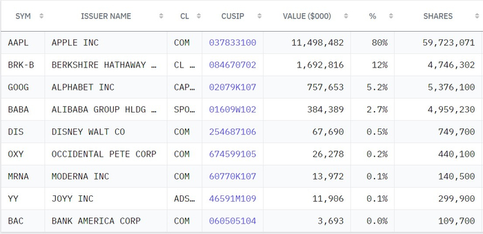 根据数据,第四季度H&H International Investment持仓总市值为144.56亿美元,共持有9家公司,分别为:苹果(AAPL.US)、伯克希尔(BRK-B.US)、谷歌(GOOG.US)、阿里巴巴(BABA.US)、迪斯尼、西方石油(OXY.US)、Moderna(MRNA.US)、欢聚时代(YY.US)、美国银行(BAC.US)。