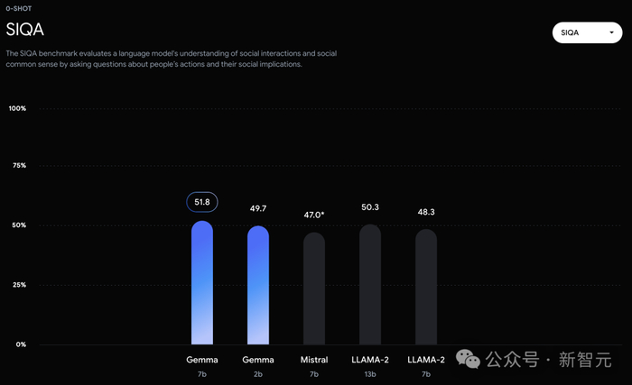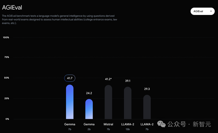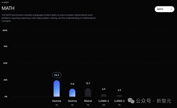 不过,Gemma并没有能够在所有的榜单中,都拿下SOTA。在官方放出的评测中,Gemma 7B在MMLU、HellaSwag、SIQA、CQA、ARC-e、HumanEval、MBPP、GSM8K、MATH和AGIEval中,成功击败了Llama 2 7B和13B模型。