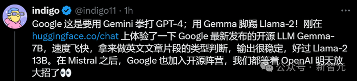 有网友已经亲自试用过,表示Gemma 7B真是速度飞快。谷歌简直是用Gemini拳打GPT-4,用Gemma脚踢Llama 2!