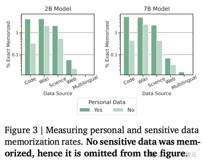 可以发现,Gemma的记忆率明显更低(见图2左侧)。不过,通过对整个预训练数据集的「总记忆量」进行估算,可得一个更为准确的评估结果(见图2右侧):Gemma在记忆训练数据方面的表现与PaLM相当。个人信息的记忆化问题尤为关键。如图3所示,研究者并未发现有记忆化的敏感信息。
