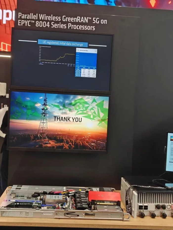 AMD EPYC系列服务器正在发挥重要作用。其中,代号“Siena”,基于“Zen 4c”精简架构开发的AMD 第四代EPYC 8004处理器表现尤为突出。在本届巴展上,AMD与三星展示了由EPYC 8004处理器支持的虚拟RAN解决方案,基于这一方案,三星和沃达丰在近期成功演示了端到端呼叫,实施业界首个Open RAN网络。方案证明了AMD EPYC处理器在提供可靠、可持续、超越电信级性能vRAN和Open RAN解决方案的领先地位。