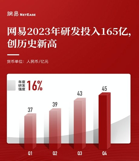 目前,网易生成式AI等关键自研技术已全面渗透游戏、音乐、教育等核心业务工作流程,大幅提升数字生产力,辅助突破多个内容垂类赛道,为长期发展注入鲜活动能。 2023年研发投入165亿元创新高,占总营收的比例约16%。