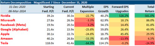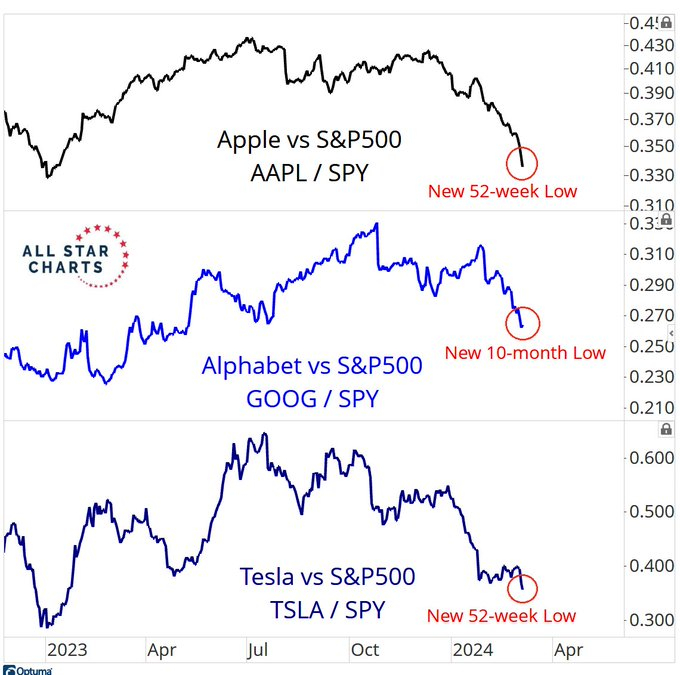 而第三梯队则无疑由年内迄今下跌的“巨头”构成——它们分别是谷歌(-4.04%)、苹果(-12.22%)和特斯拉(-28.10%)。这三家巨头在去年股价大涨后,如今都遇到了各自的瓶颈和新的利空,尤其是跌幅最大的特斯拉,眼下坊间已不断浮现出将其踢出“七巨头”阵营的呼声。