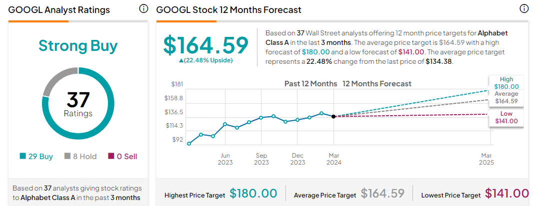 在过去三个月,至少有37家券商机构给出过谷歌A评级,其中29家建议买入,8家建议持有。对未来12个月的平均目标价预估为164.59美元,最高预估为180美元,最低预估为141美元。