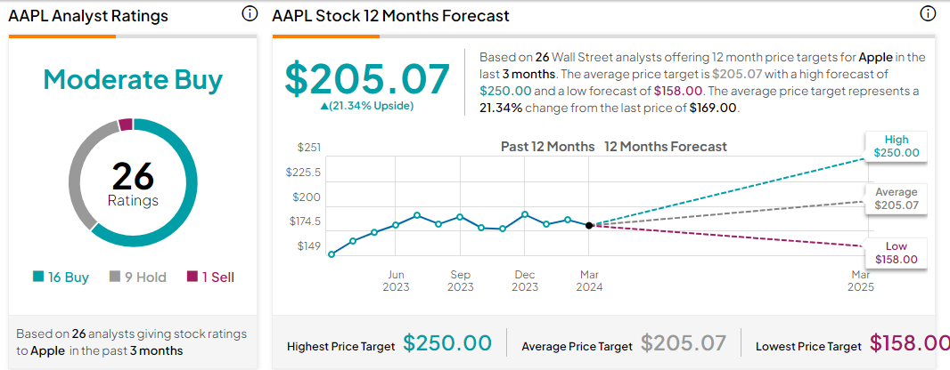 在过去三个月,至少有26家券商机构给出过苹果评级,其中16家建议买入,9家建议持有,1家建议卖出。对未来12个月的平均目标价预估为205.07美元,最高预估为250美元,最低预估为158美元。