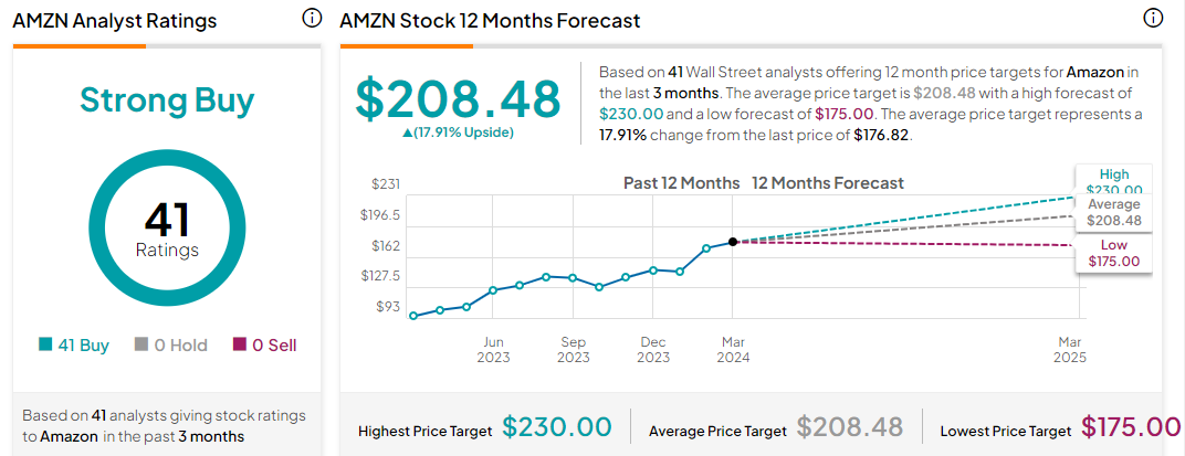 在过去三个月,至少有41家券商机构给出过亚马逊评级,全部建议买入。对未来12个月的平均目标价预估为208.48美元,最高预估为230美元,最低预估为175美元。