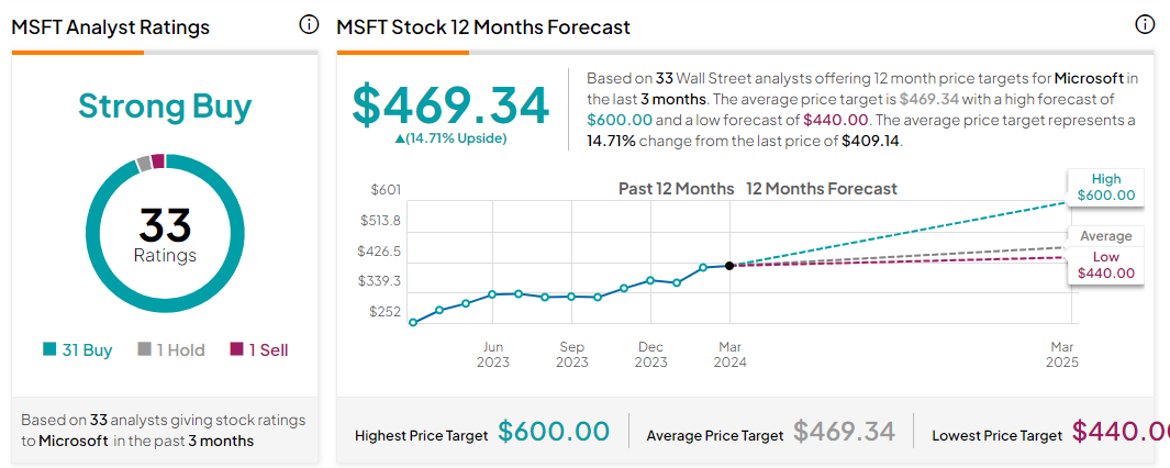在过去三个月,至少有33家券商机构给出过微软评级,其中31家建议买入,1家建议持有,1家建议卖出。对未来12个月的平均目标价预估为469.34美元,最高预估为600美元,最低预估为440美元。