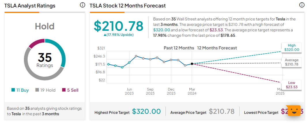 在过去三个月,至少有35家券商机构给出过特斯拉评级,其中11家建议买入,19家建议持有,5家建议卖出。对未来12个月的平均目标价预估为210.78美元,最高预估为320美元,最低预估为23.53美元。