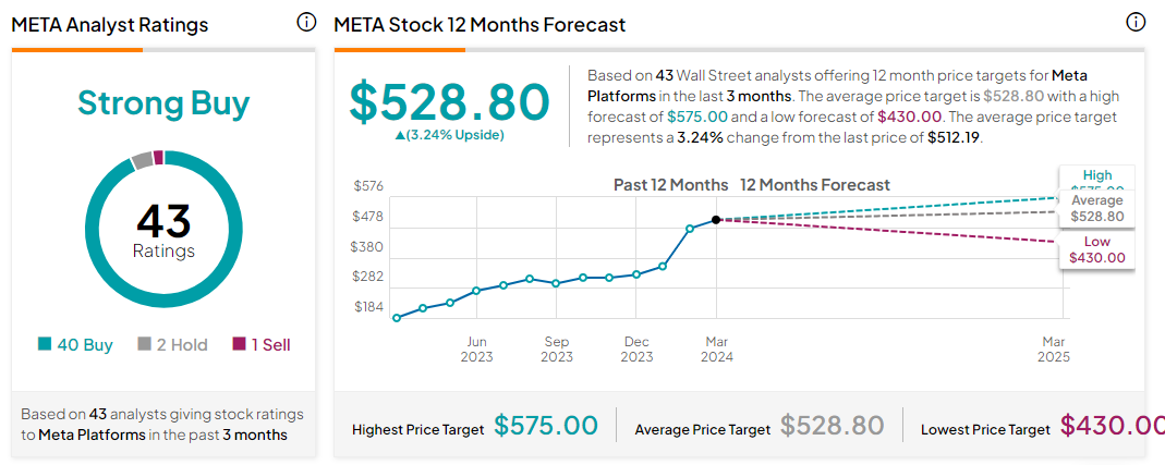 在过去三个月,至少有43家券商机构给出过Meta评级,其中40家建议买入,2家建议持有,1家建议卖出。对未来12个月的平均目标价预估为528.80美元,最高预估为575美元,最低预估为430美元。