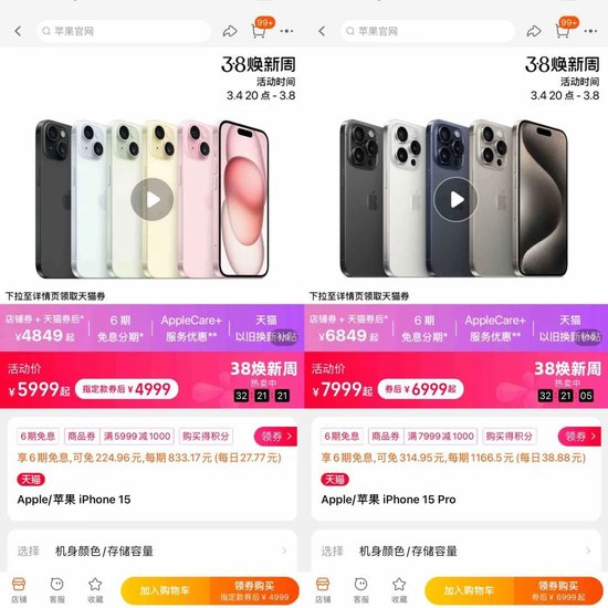 本周三八妇女节期间,苹果官方运营的Apple Store天猫旗舰店正在进行“38焕新周”活动,iPhone 15系列价格较首发价直降一千元,iPhone 15券后4999元起,iPhone 15 Pro券后6999元起。