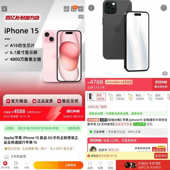 在非官方渠道,价格比上述渠道还要更加便宜。在三大电商平台的“百亿补贴”频道,iPhone 15起售价目前仅4588元起,iPhone 15 Pro券后最低到手价只要6498元。
