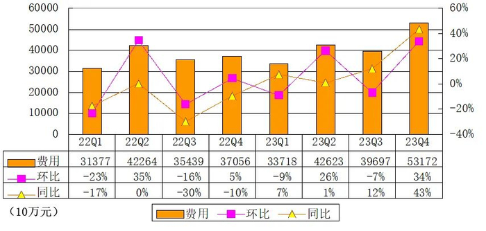 贝壳2023年第四季度一般及行政费用为26.48亿元,较上年同期的17.92亿元增长47.7%。
