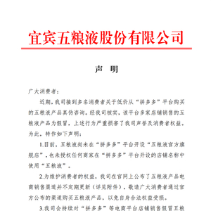 3月13日,五粮液在其官方平台发布一则声明称,近期,接到多名消费者关于低价从“拼多多”平台购买的五粮液产品真伪咨询。经公司核实,该平台多家店铺销售的五粮液产品为假冒,上述行为严重损害了消费者权益和公司声誉。