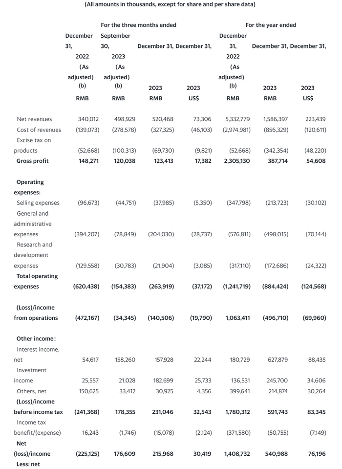 雾芯科技2023年第四季度净利润为2.16亿元(约3040万美元),而2022年第四季度净亏损2.251亿元;不按美国通用会计准则(Non-GAAP),净利润为4.326亿元(约6090万美元),而2022年第四季度净利润为2.497亿元。