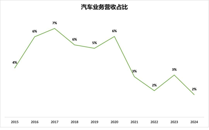 汽车业务的营收占比在2017年达到最高值7%,随后开始不断下跌。