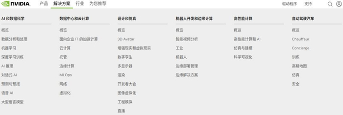 在英伟达的官网上的产品序列中找不到NVIDIA Drive相关的产品,取而代之的是整个自动驾驶汽车业务被放在了「解决方案」的分类里,这里可以看出英伟达对汽车业务的战略变化。