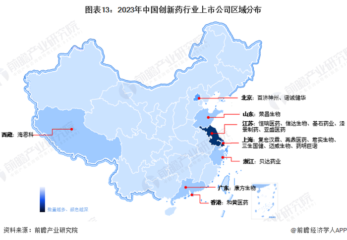从创新药上市企业区域分布情况来看,创新药上市企业主要分布在东部沿海地区,并且在长三角一带聚集,尤其以江苏省和上海市为代表,上海市创新药上市企业有复宏汉霖、再鼎医药、君实生物、三生国健、迈威生物、药明巨诺等;江苏省创新药上市企业有恒瑞医药、信达生物、基石药业、泽景制药、亚盛医药等。