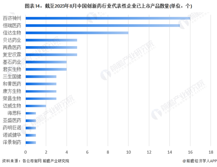 从已上市产品数量情况来看,截至2023年8月,百济神州、恒瑞医药、信达生物已上市产品数量遥遥领先,分别为16个、15个和10个。