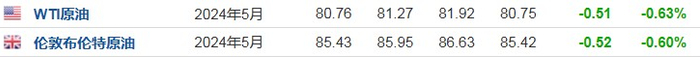 3.截至发稿,WTI原油跌0.63%,报80.76美元/桶。布伦特原油跌0.60%,报85.43美元/桶。