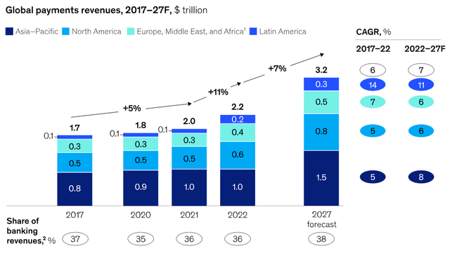 我正在考虑以下因素作为他们的全年指导:-2023年麦肯锡全球支付报告预测,2022年至2027年全球支付收入预计将以7%的复合年增长率增长,过去五年电子交易的增长率几乎是支付收入整体增长的三倍。在我看来,PayPal将受益于数字支付日益普及带来的结构性增长顺风。