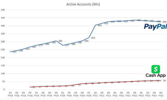 过去几年支付交易量增长有几个原因。PayPal于2013年收购了总部位于芝加哥的Braintree,Braintree和品牌结账服务的总支付量持续增长。Braintree的无品牌结账服务为商户提供无缝、一站式、实惠的结账服务,受到中小商户的欢迎。2023财年第四季度,PayPal的全球品牌结账量按固定汇率计算增长了5%,23财年全年增长了6%。因此,他们的品牌和非品牌结账服务的数量都在增长。此外,PayPal的Venmo提供数字钱包。2024年1月,PayPal推出了六项新创新,以彻底改变商业。从战略上讲,PayPal扩展了Venmo的产品服务,以利用利润丰厚的数字商务和钱包市场。Mordor Intelligence的数据显示,2019年至2029年数字支付市场预计将以11.08%的复合年增长率增长,增长主要由移动钱包、电子商务以及官方数字支付计划的日益采用等因素推动。因此,尽管PayPal活跃用户总数增长放缓,但PayPal的支付交易量和利润仍可继续增长。下图比较了PayPal和Block(SQ)Cash App之间的活跃账户增长情况,PayPal在用户基数方面与竞争对手相比仍然保持着显着的优势。
