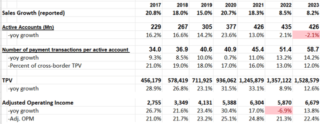 PayPal(NASDAQ:PYPL)的活跃用户数量增长缓慢,因为他们已经过了快速增长阶段。目前,该公司正专注于支付交易,并试图推出一些创新服务,包括信用卡和Fastlane,以更好地从其用户群中获利。如下表所示,2023财年每个活跃账户的支付交易笔数增长了14.2%,其中跨境支付交易笔数占总数的12%。2023财年总处理量同比增长12.6%,显着改善。其调整后的营业收入在2023财年增长了13.8%,该公司宣布计划在2024财年通过直接裁员和取消空缺职位,将全球员工人数减少9%。