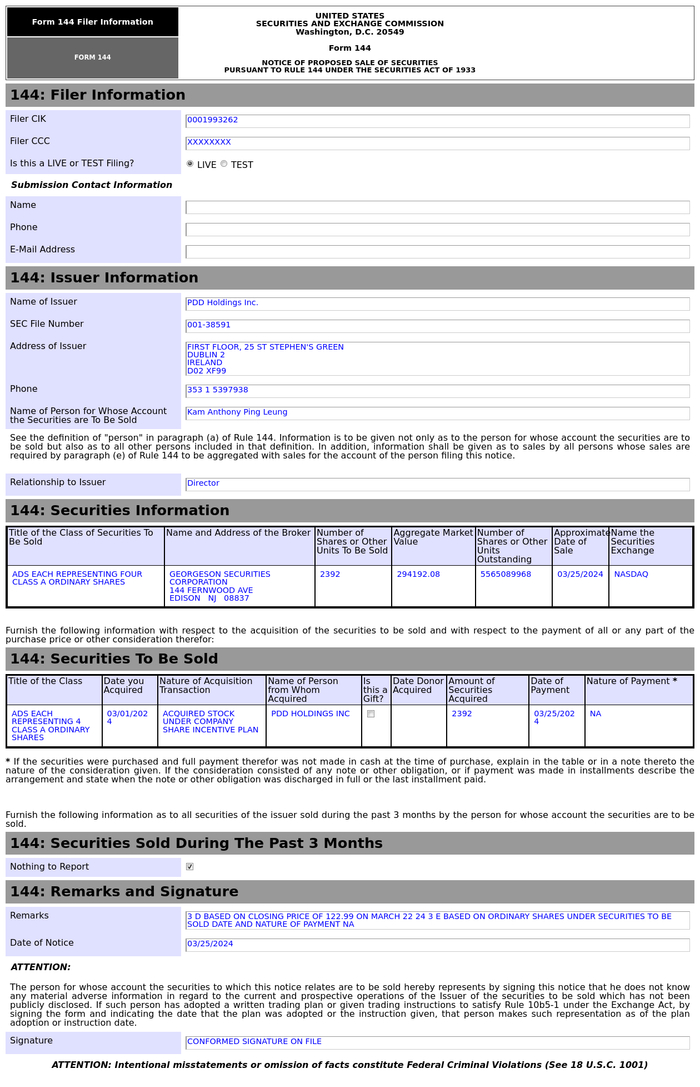 Form 144 | 拼多多(PDD.US)董事拟出售2,392股股份,价值约29.42万美元
