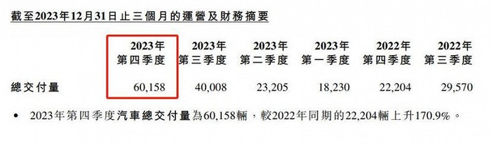 2023年Q4,小鹏交付量为60158辆,同比增长171%,环比增长50%,突破公司单季交付6万里程碑。据了解,Q3期间小鹏推出了爆款车型G6,仅上市1个月订单数就超4万。