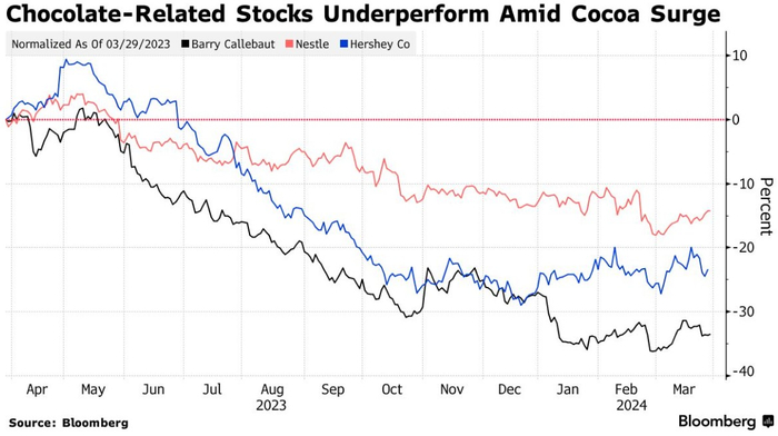 全球巧克力相关股票已经感受到了热度。瑞士的雀巢、吉百利和巧克力生产商亿滋以及全球最大的散装巧克力生产商百乐嘉利宝(Barry Callebaut AG)今年都出现了下滑。