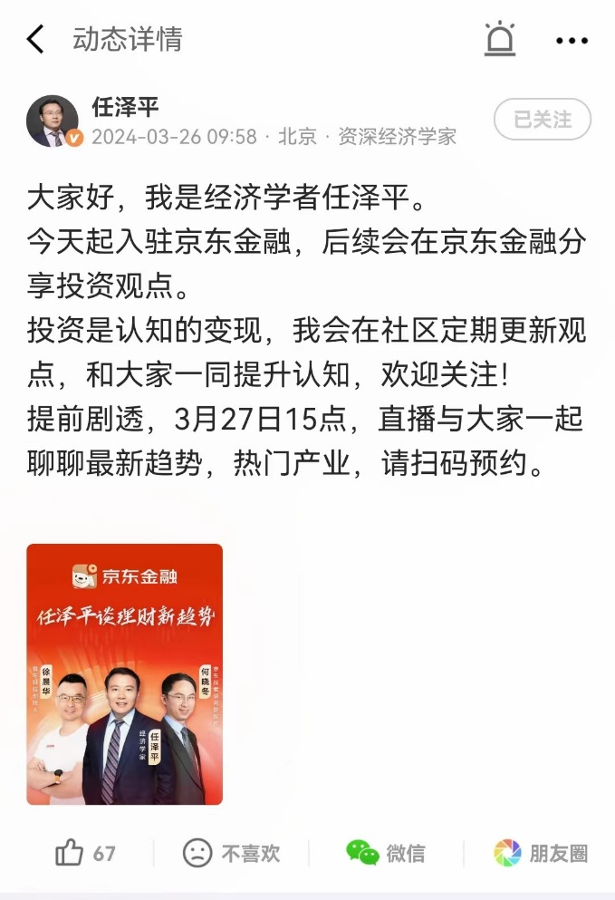 3月27日,著名经济学家任泽平在京东金融App进行理财投资新趋势的专场直播,重点解读了新能源汽车与人工智能领域的最新发展趋势以及投资机会,并分享2024理财策略建议。任泽平在现场预测了小米SU7的标配版应该在25万左右,高配版在30万元以上,并认为小米汽车进入新能源汽车前三名只是时间问题。