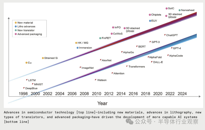 在过去的三十年里,人工智能的重大里程碑都是由当时领先的半导体技术实现的,没有它就不可能实现。Deep Blue 采用 0.6 微米和 0.35 微米节点芯片制造技术的混合实现;赢得 ImageNet 竞赛的深度神经网络并开启了当前机器学习时代的设备使了用 40 纳米技术打造的芯片;AlphaGo 使用 28 纳米技术征服了围棋游戏;ChatGPT 的初始版本是在采用 5 纳米技术构建的计算机上进行训练的。;ChatGPT 的最新版本由使用更先进的4 纳米技术的服务器提供支持。所涉及的计算机系统的每一层,从软件和算法到架构、电路设计和设备技术,都充当人工智能性能的乘数。但可以公平地说,基础晶体管器件技术推动了上面各层的进步。