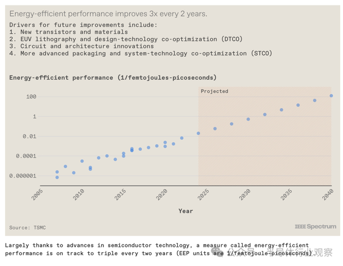 如果我们观察一个称为节能性能的指标的稳步改进,我们就可以看到服务器 GPU 中已经存在的趋势。EEP 是系统能源效率和速度(the energy efficiency and speed of a system)的综合衡量标准。过去 15 年来,半导体行业的能效性能每两年就提高了三倍左右。我们相信这一趋势将以历史速度持续下去。它将受到多方面创新的推动,包括新材料、器件和集成技术、极紫外(EUV)光刻、电路设计、系统架构设计以及所有这些技术元素的共同优化等。